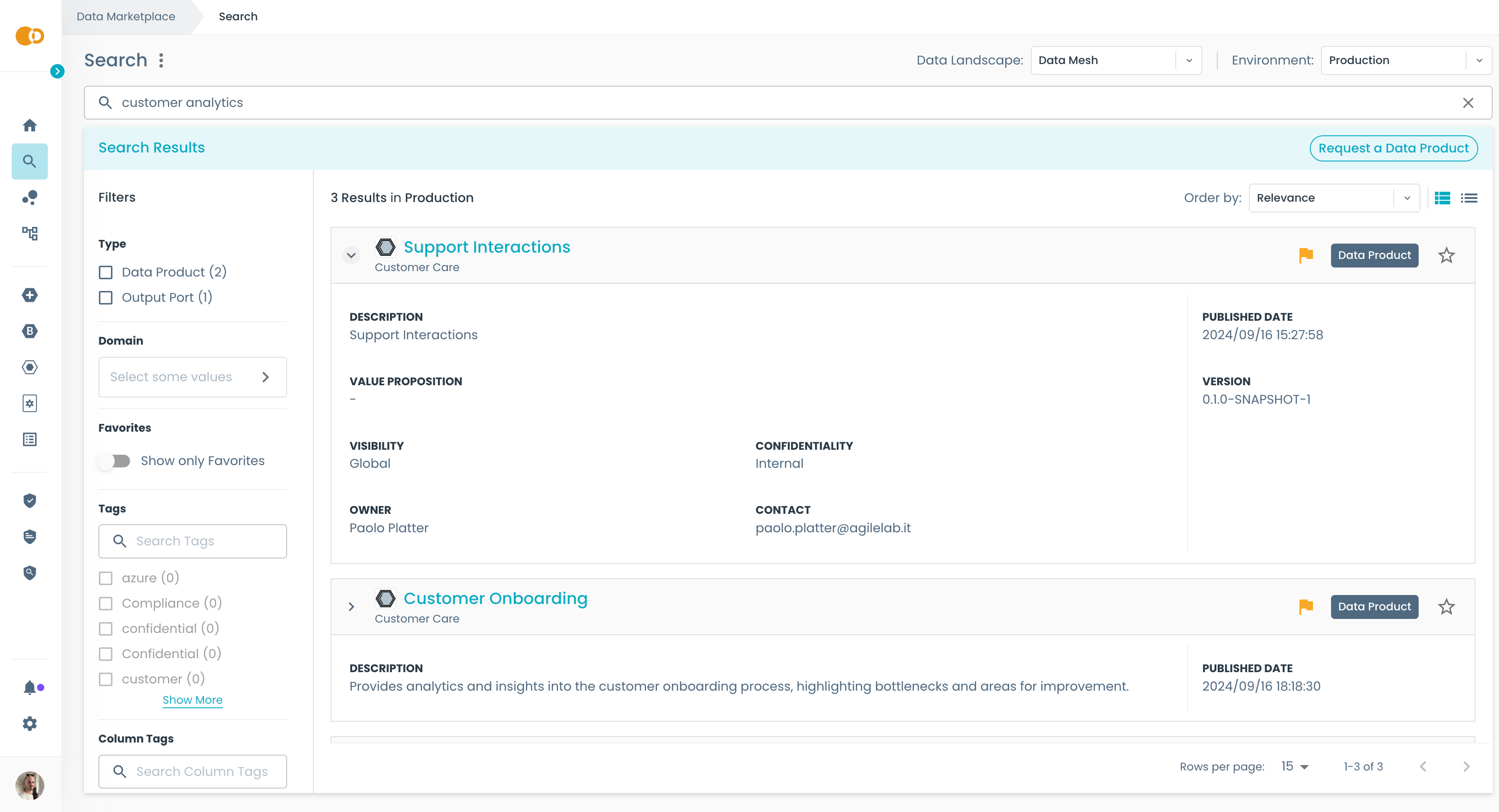 We are now looking at products that are in the Data Mesh landscape and published in the Production environment. At the top right corner you can select a different landscape and environment.